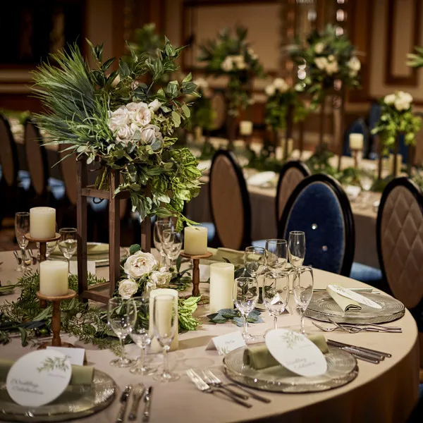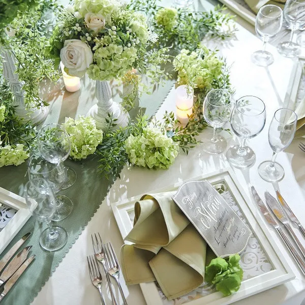 会場コーディネート 【窓の緑と溶け込む美しいコーディネート】お庭の緑とテーブルコーディネートが溶け込むようにデザインできる会場が多く、お写真映えもバッチリ。二人らしいコーディネートをご提案します。